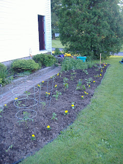 We have 2 beds, but they're not huge. We have the usual suspects: a variety of tomatoes, bell peppers, hot peppers, 2-3 kinds of eggplant, green beans, summer squash & zucchini. New for us this year are watermelon, broccoli & ground cherries. (By the way, if any of you know how to use ground cherries, let me know. We just bought them because we thought it would be something different.) We also have a bunch of different herbs--basil, cinnamon basil, parsley, etc. (See my previous post about herbs.) The beds aren't much to look at now, but we're hoping they'll be thriving soon. We used mushroom soil this year--on the suggestion of many.